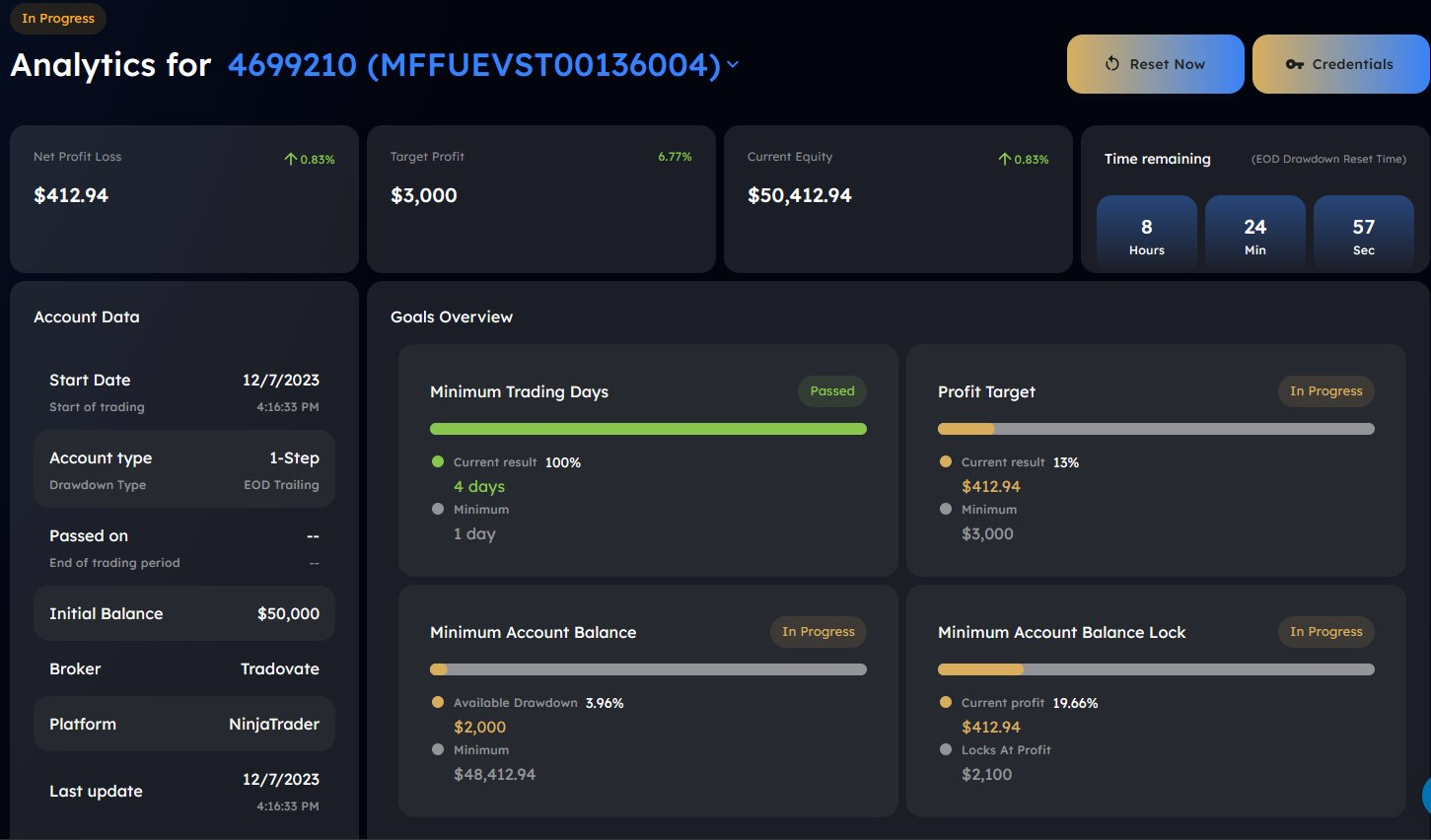 When I logged into the dashboard, the first thing I noticed was the clarity of the risk metrics. Unlike clunky competitors, I could see my End-of-Day drawdown limit clearly displayed, which stopped me from panic-closing trades during mid-day volatility. However, the "No Daily Loss Limit" marketing requires a closer look. While one won't fail for having a red day, the "Starter" plans impose strict Maximum Position Limits. You might purchase a $50k account expecting to trade 5 minis, but the dashboard will technically restrict you to 2 micros (or similar low leverage) until you build a profit cushion.